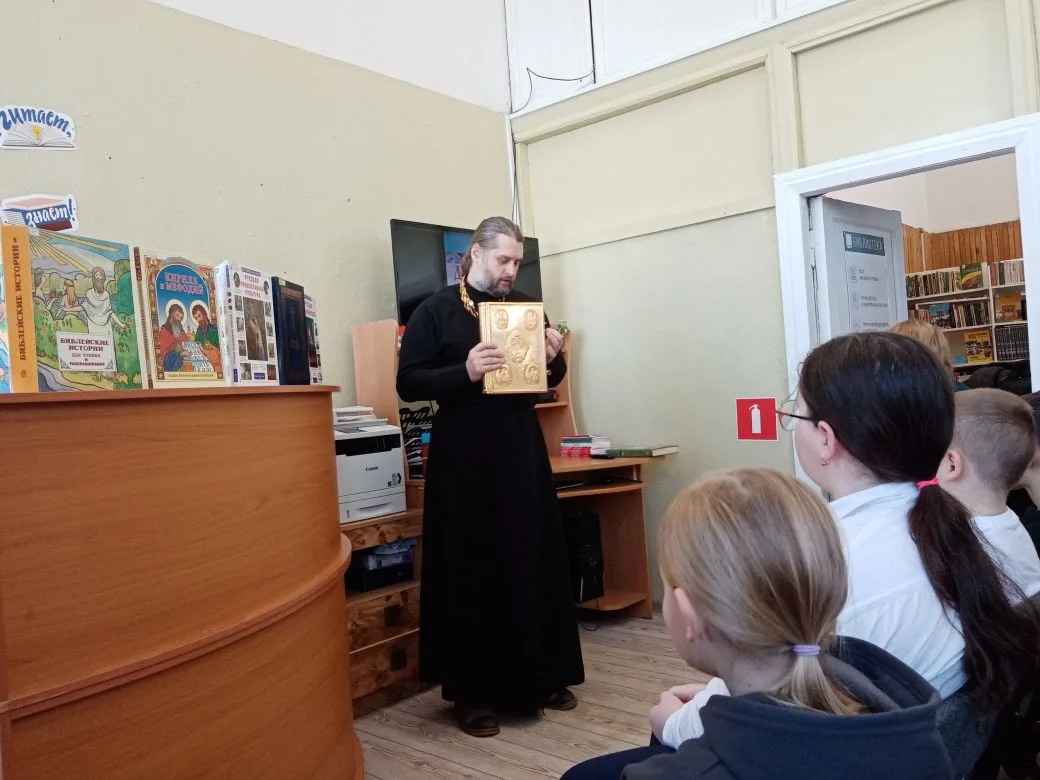 13 марта в библиотеке села Пирочи прошла встреча настоятеля Троицкого храма села Пирочи иерея Алексия Сафронова с учащимися 4 класса Сосново-Борской средней школы (учебное здание № 2 села Пирочи) и библиотекарем Н. Е. Тригуб.